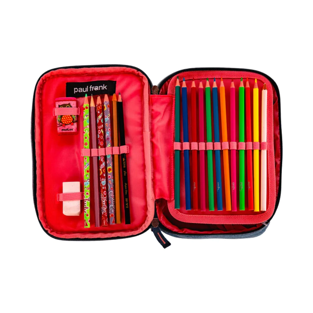 O ESTOJO PAUL FRANK TEXTURIZADO EM JEANS E INTERIOR ROSA TEM UM DESIGNE AUTÊNTICO. PRODUZIDO EM ALGODÃO, POSSUI UM COMPARTIMENTO AMPLO, COM DIVISÓRIAS E ELÁSTICOS QUE MANTÉM LÁPIS E CANETAS SEPARADOS E ORGANIZADOS CADA UM EM SEU LUGAR.