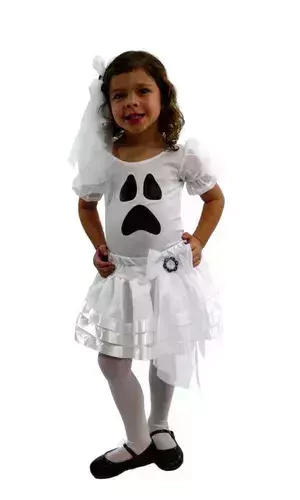 Contem um colant branco estampado de fantasminha, uma tiara e um tutu branco.