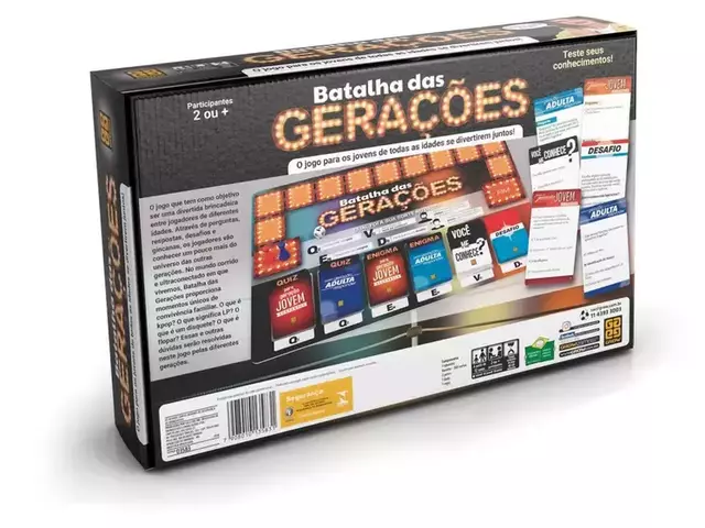 O jogo de tabuleiro Batalha das Gerações da Grow é ideal para reunir e divertir toda a família! Quem é Whinderson Nunes? O que era um LP? As gerações se juntam nesse jogo e se divertem através de charadas e desafios para rir e dividir um pouco de experiências típicas de cada geração. Um jogo ideal para jogar adultos contra crianças, crianças contra crianças e adultos contra adultos. Pode ser jogado por dois ou mais participantes a partir dos 12 anos de idade! Como um bom jogo para a família, todos podem participar com os seus desafios e gincanas. Os jogadores vão sendo desafiados sobre o universo das outras gerações. No mundo ultra conectado de hoje, a Batalha das Gerações proporciona momentos únicos de convivência familiar!