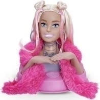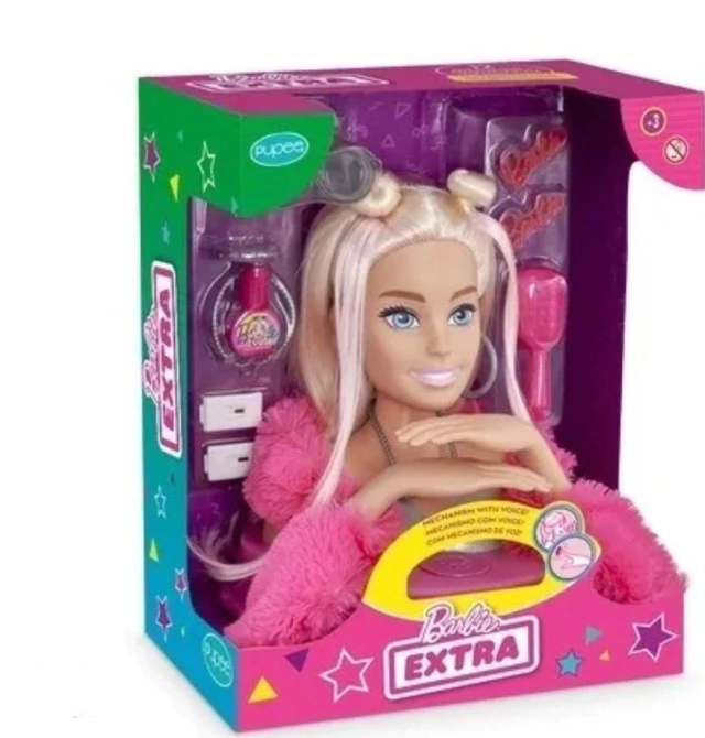 A última linha de bonecas barbie styling head extra com 12 frases inclui 01 boneca barbie extra, 01 mecanismo de voz, 01 par de óculos, 01 estola em tecido, 01 escova para cabelo, 01 par de brincos, 01 esmalte para boneca, 02 presilhas retangulares, 02 presilhas com logo barbie e 3 colares personalizados.